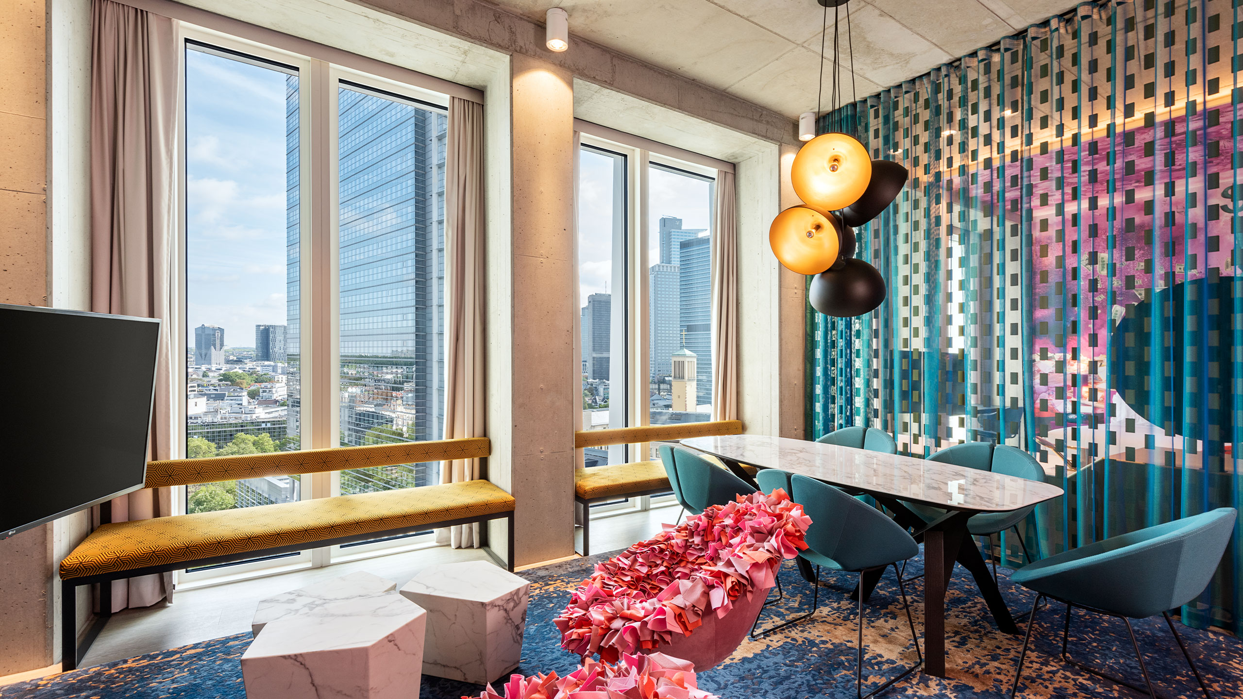 Wir freuen uns sehr, Ihnen für das Hochschullehrerkonvent 2026 ein Zimmerkontingent im „Hotel nhow Frankfurt“ anbieten zu können. Das Hotel befindet sich in einem beeindruckenden Wolkenkratzer unweit des Hauptbahnhofes. Von der NFT SKYBAR hat man einen Panoramablick über ganz Frankfurt. Jedes der 350 Hotelzimmer besticht durch sein individuelles Design. Aber auch als Konferenzort ist das nhow Frankfurt bestens geeignet – wovon wir uns im Januar persönlich überzeugen können.